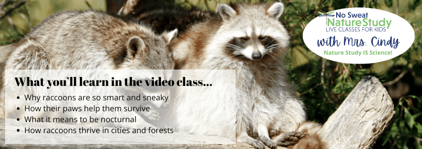 Get ready to meet one of the cleverest night creatures around in the upcoming No Sweat Nature Study video class, all about raccoons. Students will explore the amazing adaptations that help raccoons thrive in both wild and urban environments, from their ringed tails and masked faces to their nimble paws and sharp problem-solving skills.