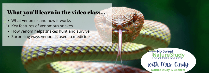 Through an engaging nature journaling activity, students will draw and label the parts of a venomous snake while noting important details about its prey, habitat, and survival strategies. The class is perfect for 1st–8th graders and is available as part of the No Sweat Nature Study membership, which includes more than 175 science-rich video lessons just waiting to be enjoyed.